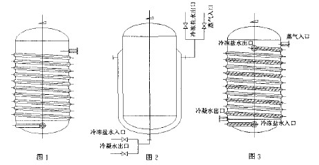 該廠大部分“U”夾套結(jié)構(gòu)反應(yīng)釜為常壓操作,而“U”型夾套內(nèi)常通 人0.3MPa-0.6MPa的蒸汽加熱,按《壓力容器安全技術(shù)監(jiān)察規(guī)程》劃分, 為類(D1級)壓力容器。有些反應(yīng)釜內(nèi)是冷~熱間隔操作的,有時夾 套會出現(xiàn)使用冷凍鹽水降溫后再通入蒸汽的工況,這樣一旦誤操作會發(fā)生冷凍鹽水流失,造成浪費(fèi)(見圖2)。采用雙螺旋半圓管夾套,使冷凍鹽水和蒸汽各行其道,可以徹底杜絕傳熱介質(zhì)摻混和流失的問題(見 圖3)。鑒于以上原因,我們對該廠的這一類型設(shè)備進(jìn)行了更新和改造, 設(shè)計了半圓管夾套來代替“U”型夾套。