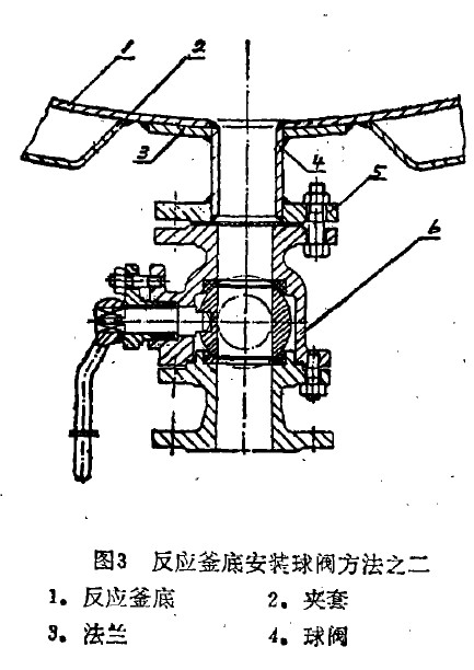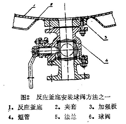 此形式是標(biāo)準(zhǔn)放料閥的性能不能滿足要求時的常用方式,可任意選用材-料相性能規(guī)格能滿足要求的通用型截止閥、閘閥或球閥等作為放料閥。近廿余年來由于球閻的迅猛發(fā)展,球閥具有流阻小、體積小,重量輕、操作靈便、不易積料等優(yōu)良性能,當(dāng)前大多都選用通用球閥安裝于放料的短管下作放料閥,如圖2所示。由于球閥有低壓和中壓多種壓力等級可選用,故此種形式在低鹺和中壓反應(yīng)釜上都可適用。