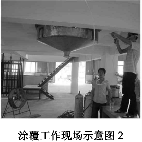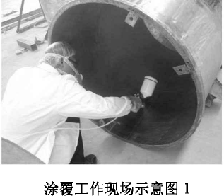 將150L的不銹鋼反應(yīng)釜側(cè)放在水平地面,操作人員鉆進(jìn)反應(yīng)釜,對(duì)反應(yīng)釜內(nèi)壁進(jìn)行噴涂。為避免霧氣對(duì)人員在操作過程中的傷害,噴涂人員佩戴防毒面具,頭戴防塵帽。并在反應(yīng)釜開口處安裝了工業(yè)風(fēng)扇對(duì)霧氣進(jìn)行消除,以減少對(duì)人體的傷害。