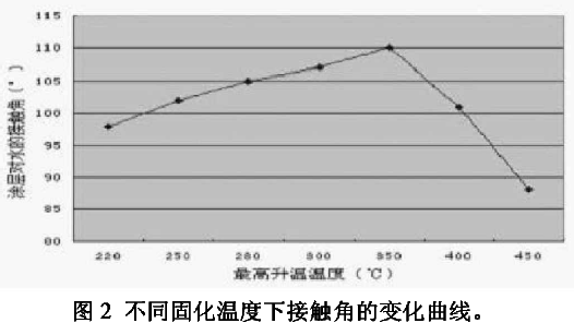 我們發(fā)現(xiàn)固化溫度影響涂層的表面性能。為優(yōu)化固化溫度,涂層在20一450℃不同溫度下固化,測(cè)試涂層的接觸角,見圖2。結(jié)果表明,涂層固化溫度在350℃時(shí),對(duì)水的接觸角達(dá)到較大值,為110“。圖2不同固化溫度下接觸角的變化曲線。